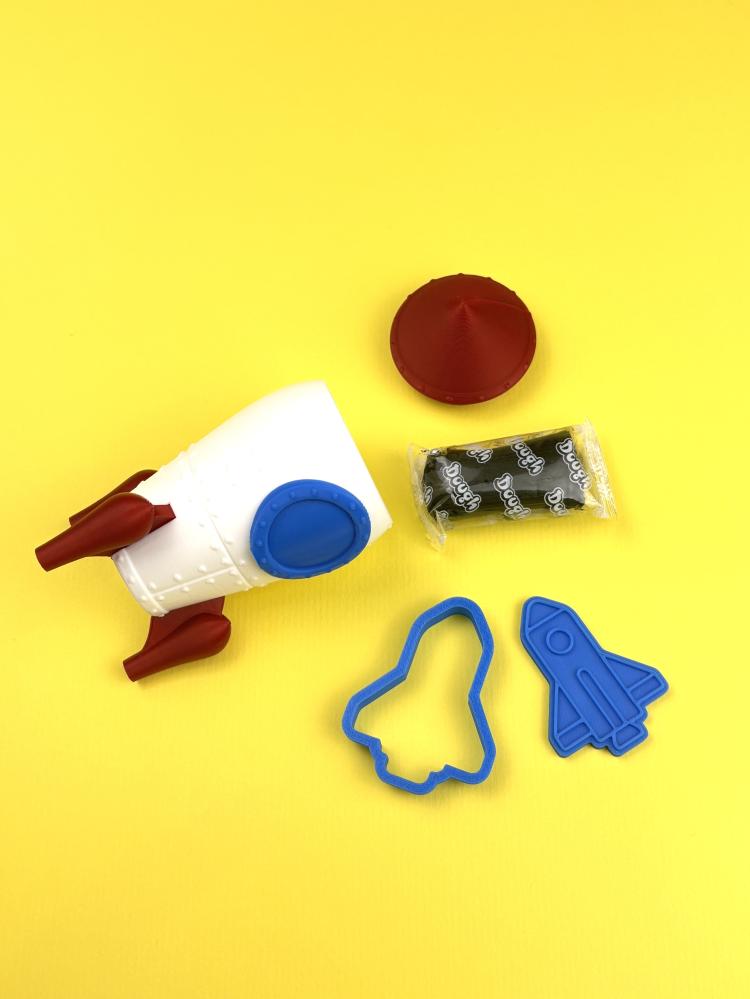 علبه ع شكل صاروخ 3D تحتوي ع : صلصال / رول / قطاعتين صلصال / تاق باسم الطفل